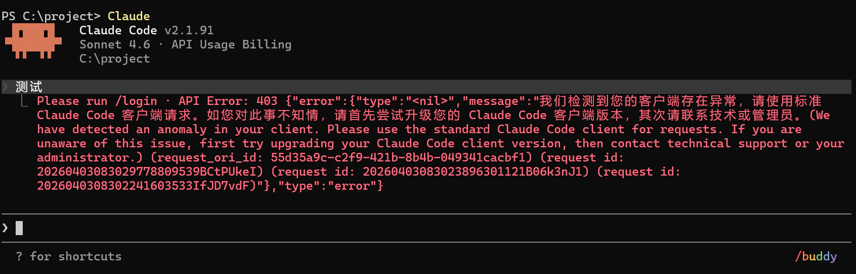 Q:在 Claude Code 中使用,提示「401 , No token provided…」